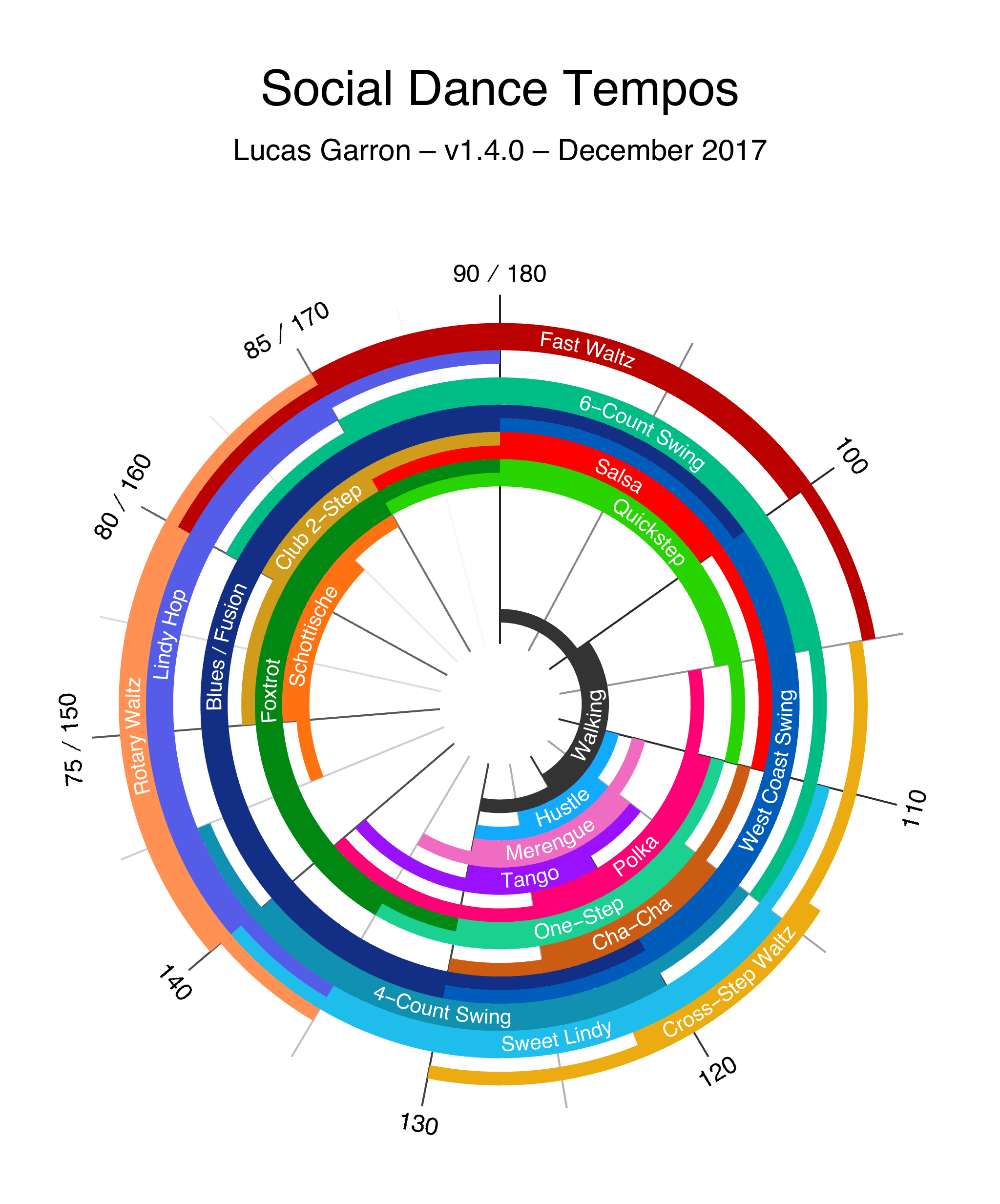 These tempos are based on Richard Powers's guidelines, in addition to personal experience DJing at events like Friday Night Waltz and talking to friends who also DJ social dances in the Stanford area. Note that these tempos are specifically tuned for “variety” social partner dancing and may not apply to:
